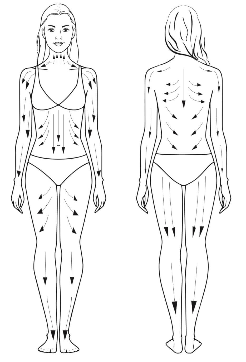 - Рекомендовано розпочати масаж з більш м’яких зон – стегон та сідниць, тримаючи масажер під кутом 45° та поступово збільшуючи силу натискань. Ці натискання не мають викликати дискомфорт чи сильний біль. Продовжити масаж за масажними лініями, вказаними на схемі.
